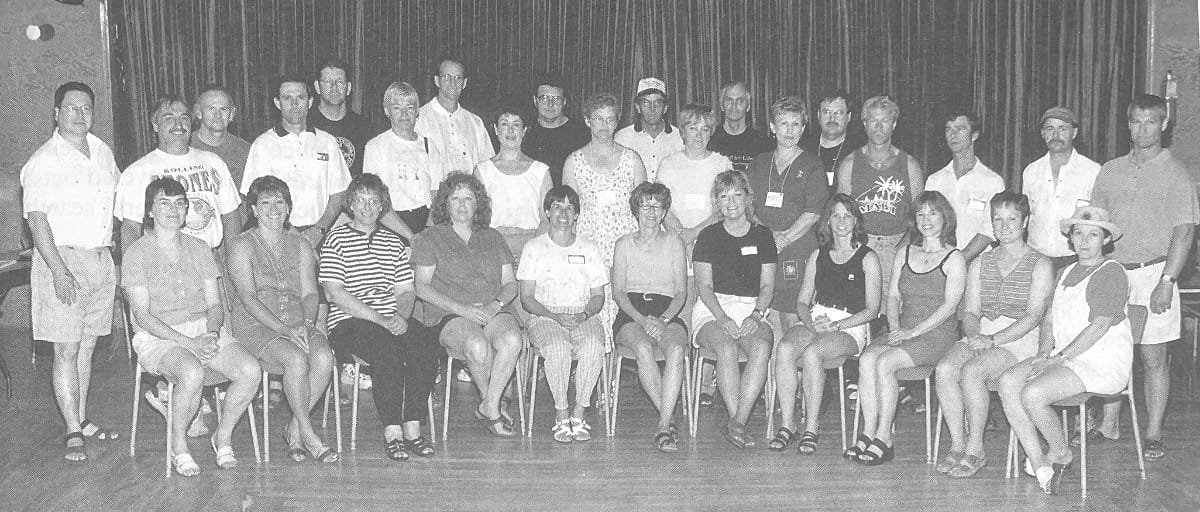 A reunion of babies born in the Eston Legion Hall from 1952-1955 took place in the year 2000. Standing L-R: Laurie Thompson, Doug Antony, Norman Mulder, Dennis Martin, Bill Sutherland, Judy Miller, Neil Rooke, Cheryl Knight, Bob Chaplin, Karen Stephan, Glenn Hartsook, Cathy Kruczko, Wayne Eichel, Gail Bruce, Blair Thompson, Wes Peterson, Brady Richardson, Max Richardson, Jim Meyer. Front (L-R): Diane Chaplin, Cathy Adams, Maureen Hallett, Bonnie Jeffery, Penny Collins, Sonya Cook, Beryl Pearce, Barbara Northcott, Pam Oliphant, Shelly Japp, Nancy Hartsook.