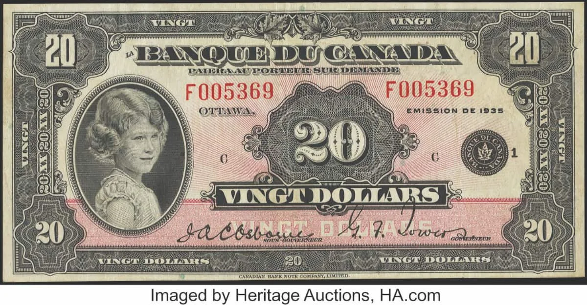 Queen Elizabeth I appeared on a Canadian $20 bill in 1935 at the age of nine. The bill is exceptionally rare, as high-denomination notes had limited circulation at the time.