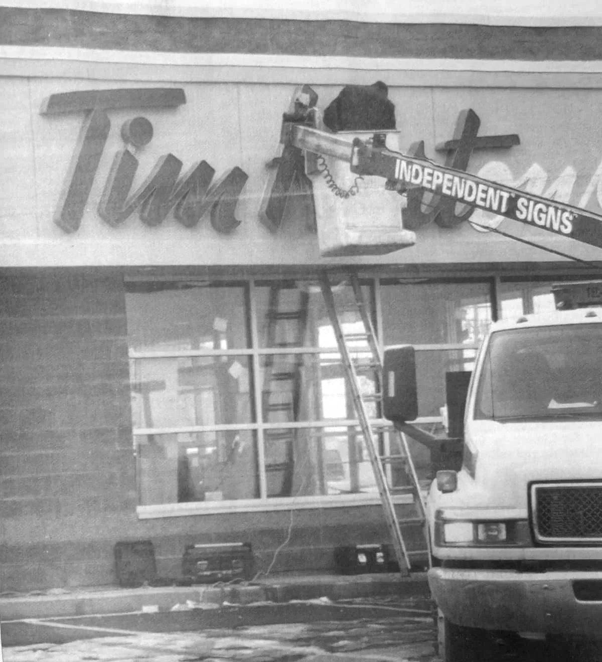 The Tim Hortons franchise opened its doors twenty years ago in Kindersley on November 19, 2005. The photo shows signs being installed on the building.