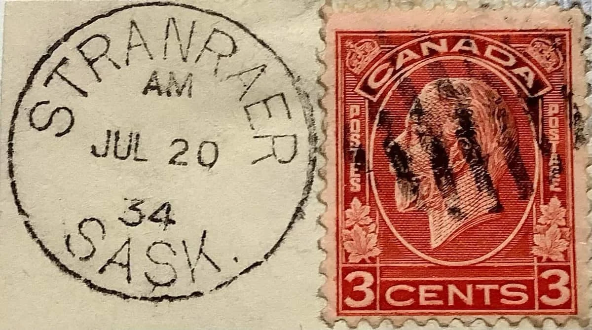 A 1934 cancellation on a three cent stamp from the Stranraer post office.