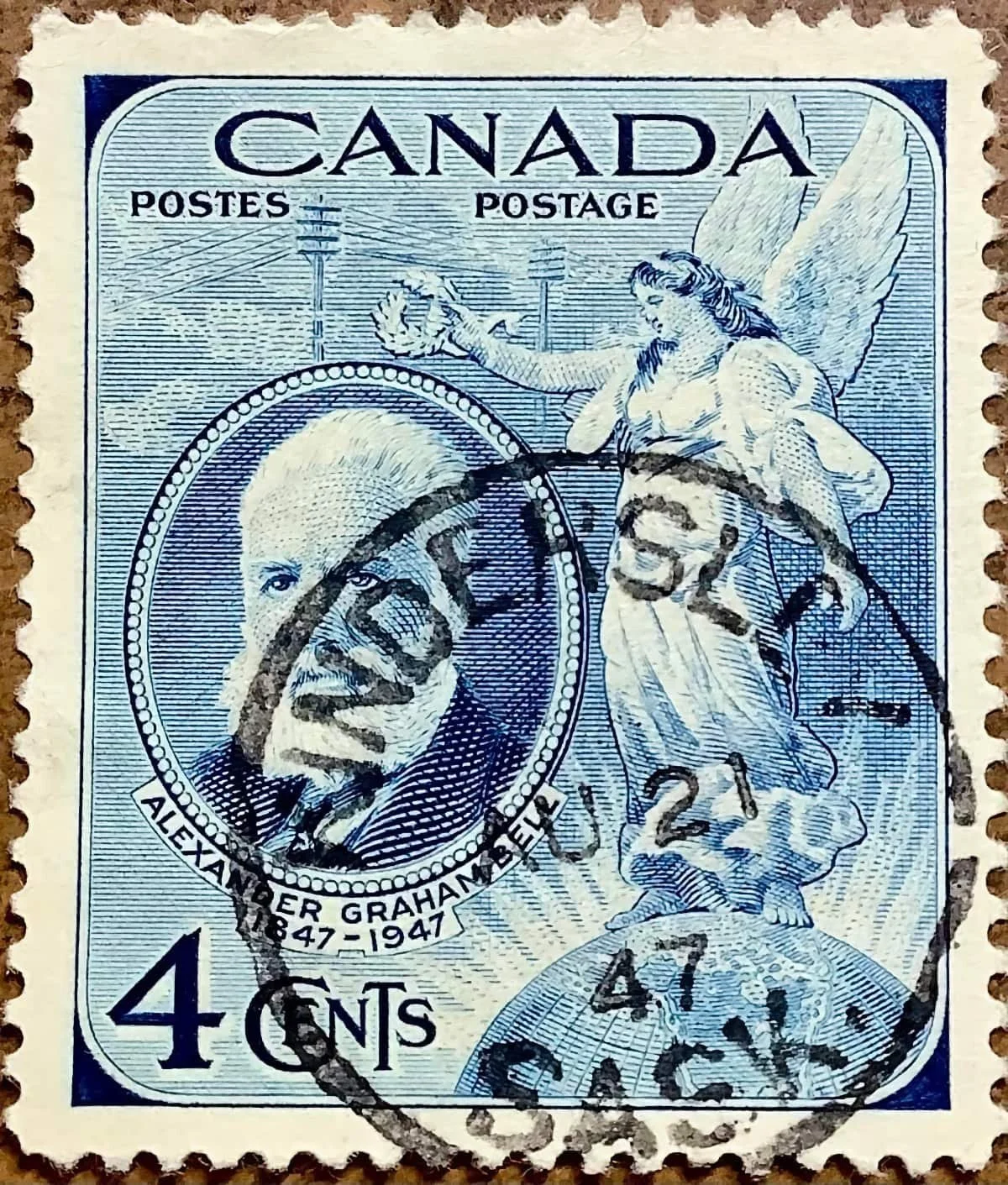 Commemorative stamp from 1947: The 1947 Alexander Graham Bell 4 cent commemorative stamp was beautifully engraved and issued by Canada. The stamp was released on the 100th anniversary of Alexander Graham Bell’s birth. Pictured is a stamp that was cancelled at the Kindersley post office in 1947. Photo submitted by Brian Towe/Historic Saskatchewan